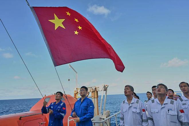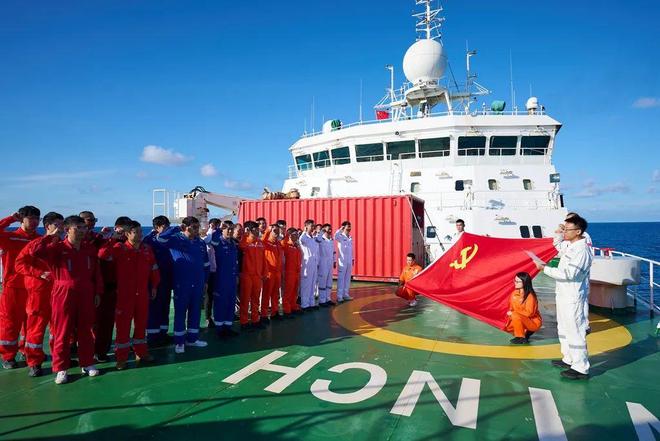 怀着对祖国的真挚祝福,科学”号全体船、队员统一着装,列队整齐,党员佩戴党徽,向冉冉升起的五星红旗行注目礼,齐唱国歌表达对祖国最崇高的敬意和最真挚的祝福。雄壮的国歌声响彻云霄,鲜艳的五星红旗高高飘扬。随后,全体党员在航次首席科学家谢炎领读下重温入党誓词,嘹亮的铮铮誓言,激昂心头的真挚情感,让现场所有人都深受感染,更加坚定了作为一名中国共产党员践行誓言、终生不渝的初心和信念。国旗升至顶端的那一刻,在“科学”号科考船的船舷,“发现”号水下机器人(ROV)缓缓入海,开始了新一次的深海探索之旅。