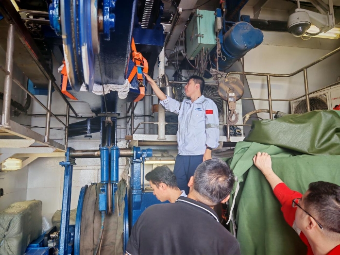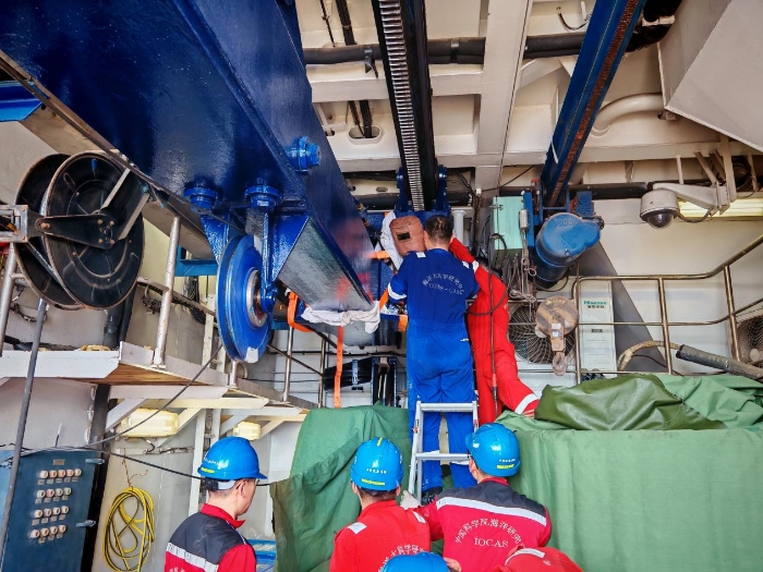 航次初始,2号主柴油机缸头严重漏水无法使用,在临时党支部委员轮机长孙宗强的带领下,轮机部党员和骨干力量团结一致,快速排查故障原因,连续奋战2天,完成2号主机关键部件更换,故障得以修复,保障船舶动力系统稳定运行。CTD作业过程中水文绞车吊臂液压缸突发渗漏情况,吊臂动作受限,严重影响CTD的回收和下放作业,在支部委员实验室主任孙宇峰的带领下,实验室党员对吊臂进行紧急修复,保障设备安全回收。临时党支部组织专业人员对吊臂状况进行研判,确定解决方案,轮机部和实验室共同配合对吊臂受力部位进行焊接加固工作,完成吊臂临时修理,修复至今已完成CTD作业20余次,其中全水深作业7次,修复效果满足作业安全要求,后续CTD作业可有序开展。航次期间党员江旭完成后甲板数据显示大屏的维修,党员孙毅、吕方辉、王延清等完成多波束故障维修修等抢修工作,保障航次工作顺利进行。